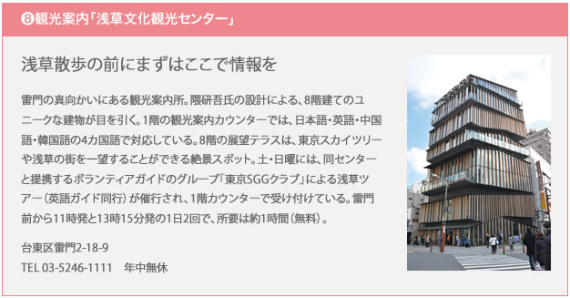 そして現在。浅草の至るところから、日本一の高さ634mを誇る超高層のスカイツリーを望むことができる。夜になれば、ライトアップされて鮮やかに浮かび上がる浅草寺が美しい。浅草レビューの復活やジャズの生演奏が聞けるパブの登場など、新しいトレンドも生まれている。浅草名物の人力車を引く車夫の呼び声は、日本語だけでなく、韓国語、中国語、英語と国際色豊かだ。古き良き伝統を大切に守り継ぐ本物の味、その一方で新しさも貪欲に取り入れて融合させてしまうからこそ、私たちはこの街に魅了されてやまないのだろう。