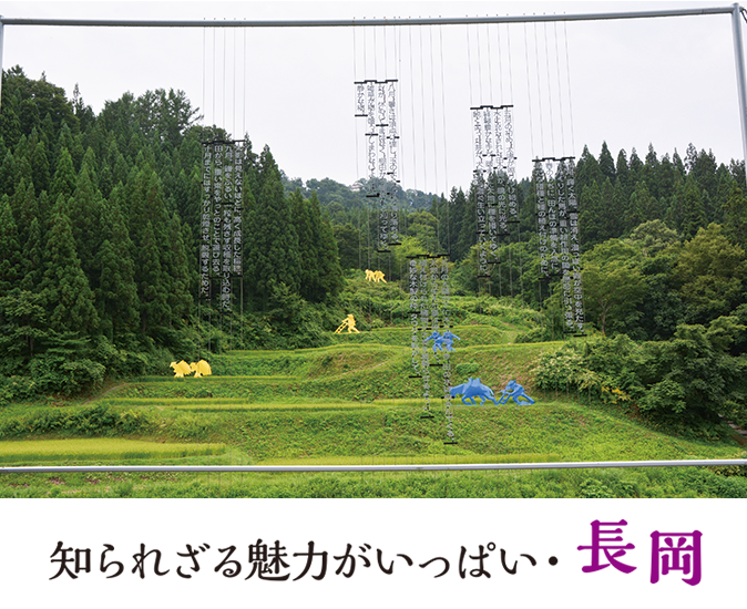新潟県の中央に位置し、山・海・川の自然に囲まれた長岡市。 古くから農業・商業・工業が栄えてきたこの町は、豊かな大地に育まれた食文化はもちろん、 芸術、蔵の町並み、歴史など、まだまだ知られざる魅力にあふれる場所である。 東京から新幹線で約1時間40分。さあ、新しい旅に出発だ!