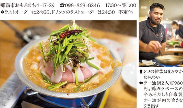 夜は一杯やりたいという人におすすめの一軒。沖縄料理の定番はもちろん、あぐー豚のメニューが豊富で、じゅわっと肉の旨みがあふれ出すメンチカツや、山盛りの野菜とあぐー豚の赤身もも肉をピリ辛みそ味でいただくラー油鍋は、箸が止まらなくなるおいしさだ。また豊後水道のトラフグなど、全国の新鮮魚介も自慢。泡盛の銘酒とともに味わいたい。